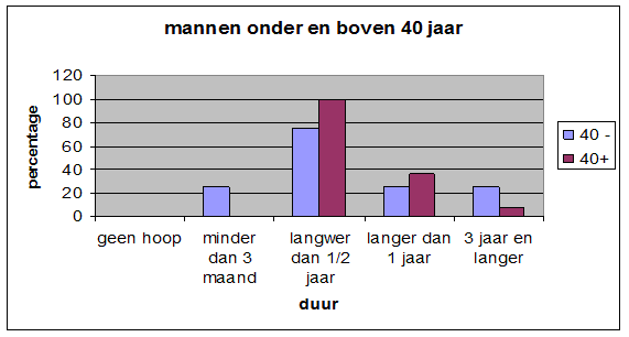 Diagram 2 laat zien dat 65 % van de door ons onderzochte 23 mannen en 55 vrouwen op Tabel 1(klik hier om deze te openen in een nieuw venster) er langer dan een half jaar en 29 % langer dan 1 jaar mee leefden. 13 % zelfs langer dan 3 jaar, of tientallen jaren. 12 van de 90 geenqueteerden zijn buiten beschouwing gelaten, omdat zij nog midden in hun crisis zaten en geen overzicht konden bieden over de lengte van hun verdriet en (valse) hoop.